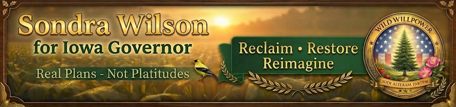 Civilian Restoration Corps™, Gardens Across Iowa!™, Gardens Across Nebraska!™, Gardens Across California!™, Gardens Across America!™, and Gardens Across Earth!™ are trademarked by Sondra Wilson (“Inventor”). All apps and technologies described are solely owned by the Inventor. Wild Willpower PAC, The Peaceable Assembly, and Sondra Wilson for Iowa Governor have express permission to reference, fundraise, and perform outreach related to these initiatives.